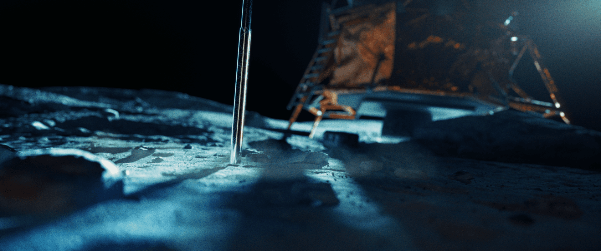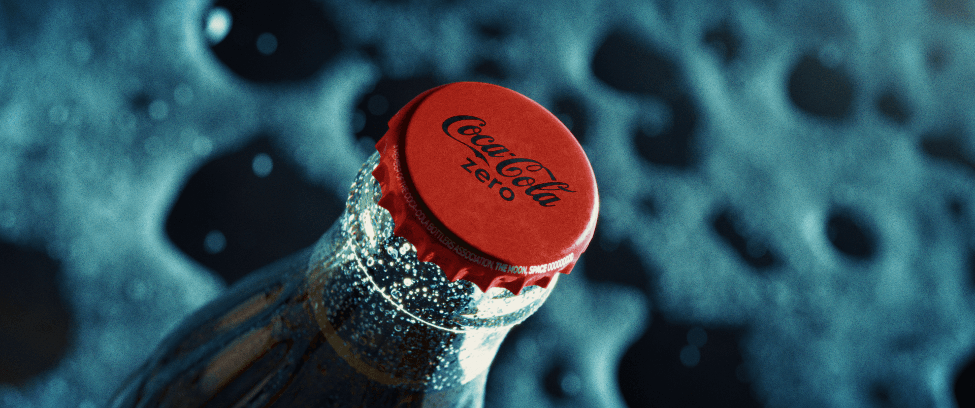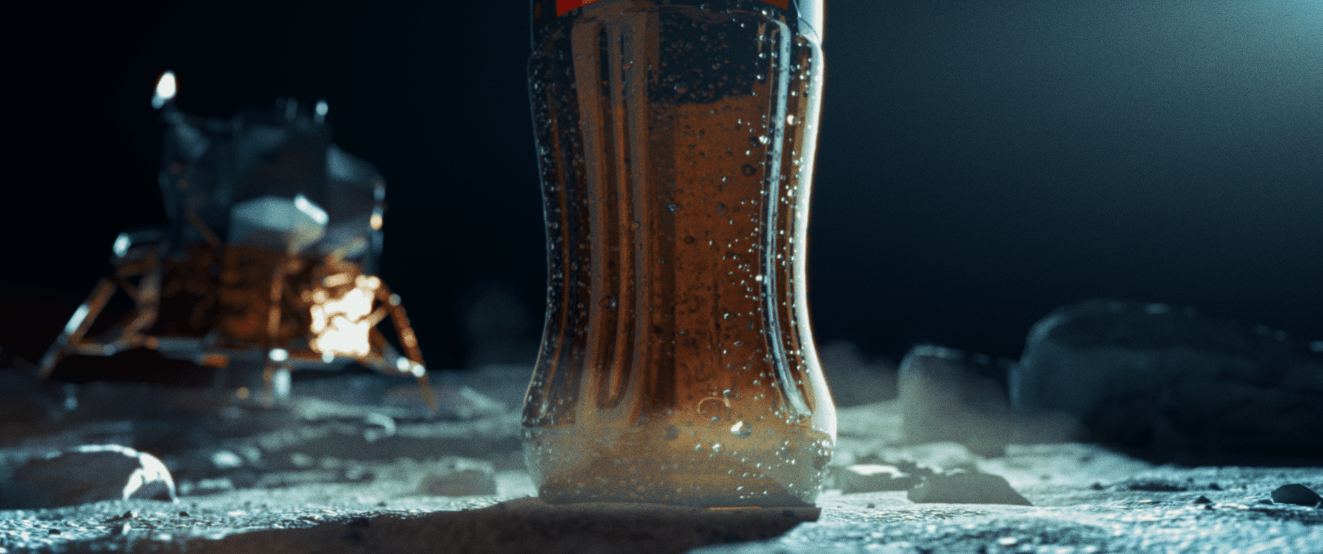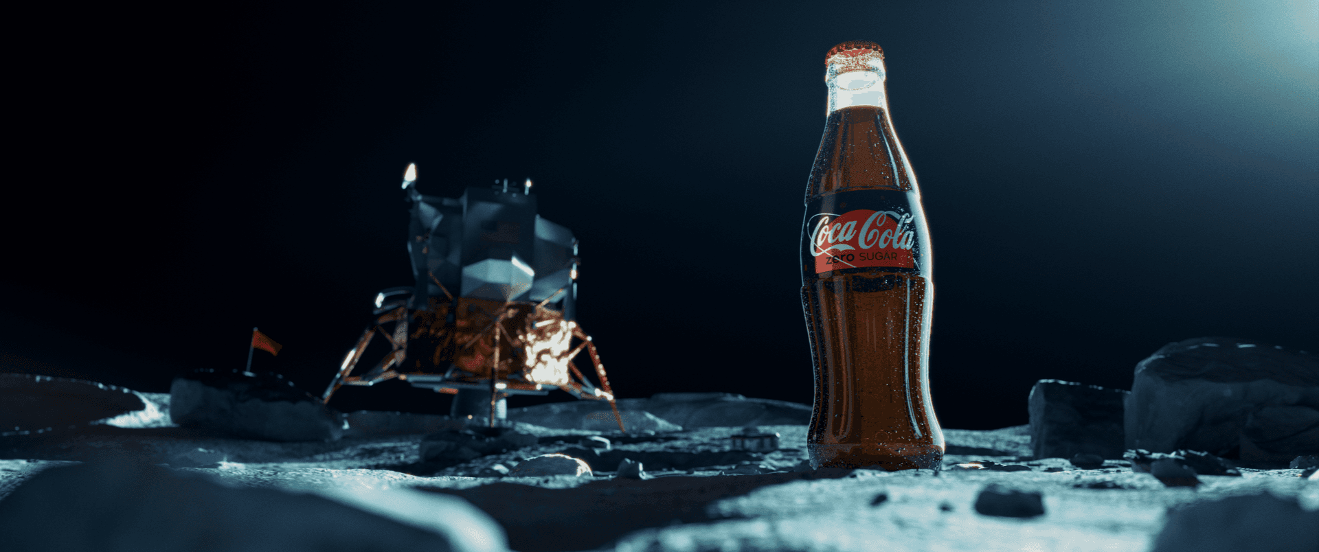 A cinematic re-imagining of the first Coke (Zero) on the Moon, combining the silence of space with vintage broadcast audio, zero gravity footprints, and a dramatic bottle reveal, delivered through the lens of hyper-real 3d/VFX, retro futuristic color treatment and Coca Cola Zero’s iconic brand designs.