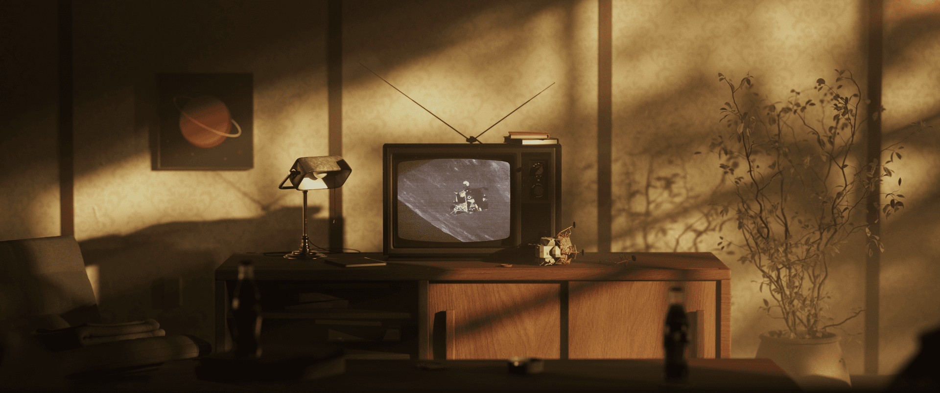 The first step was extensive research and reference gathering. I studied real footage of the Apollo moon landings, 1960s living rooms and objects, and films like First Man (2018) to understand the visual language of the era. I researched Coca Cola branding, including high-fidelity advertisements and Coke Zero’s design language, to ensure the brand was represented accurately and tastefully.