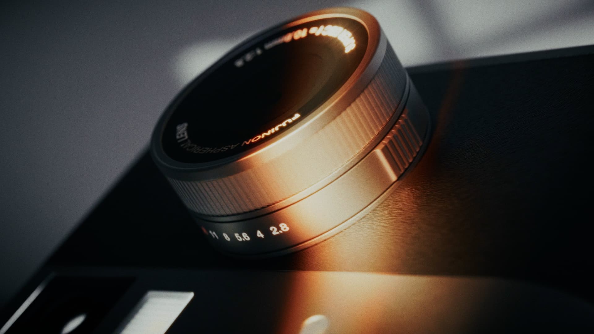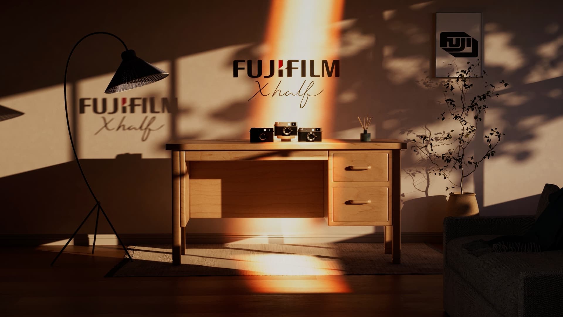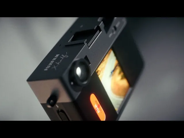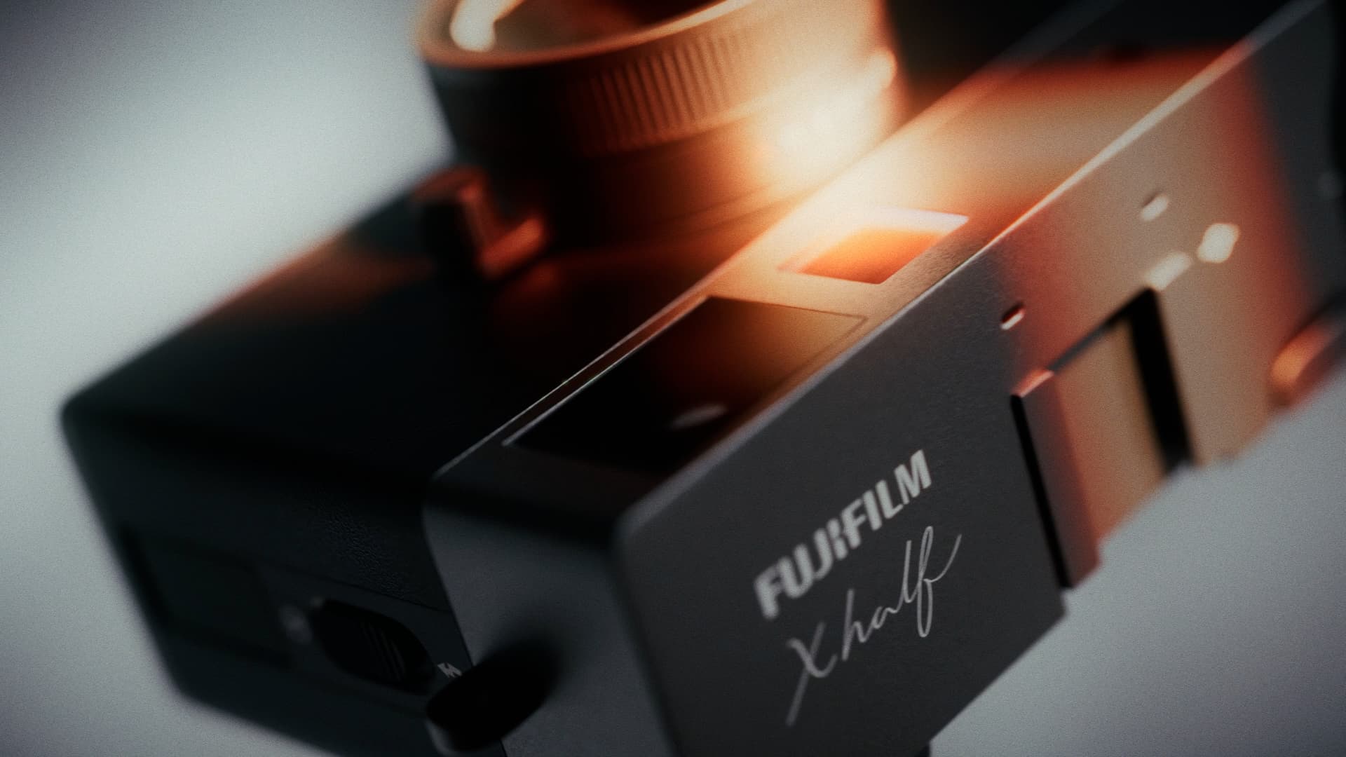 A cinematic advertisement for the Fujifilm X-Half camera, featuring a fully hard surface modeled asset, refined lighting and textures, fluid animation, custom sound design, and rich filmic color designed to elevate the camera as a premium visual object.