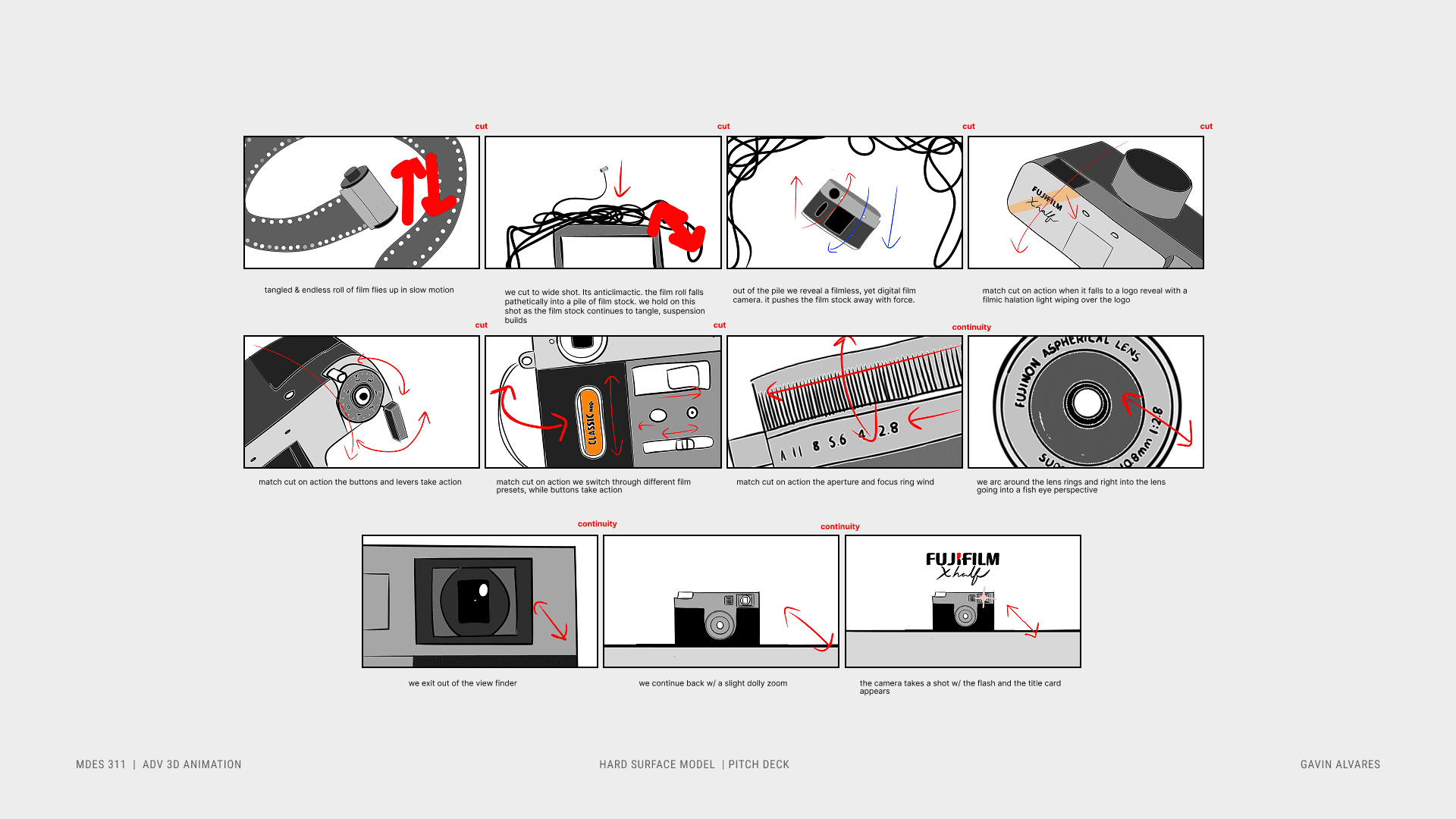 Initially, I planned a dynamic simulation featuring tangled film from which the Fujifilm X Half would emerge, highlighting the filmless digital camera. Due to time constraints, the scope was refined to focus on a product reveal, while still preserving elements and compositions from the original storyboard.